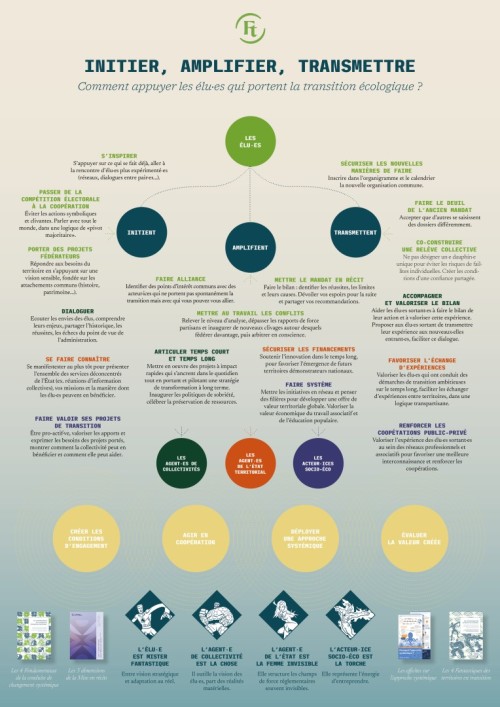 Initier, amplifier, transmettre... C'est l'enjeu des élections municipales 2026. Comment appuyer les élu·es qui portent la transition écologique ? Une affiche inspirée du référentiel d'intervention de la Fabrique des transitions et des enseignements issus des accompagnements menés au cours des cinq dernières années.