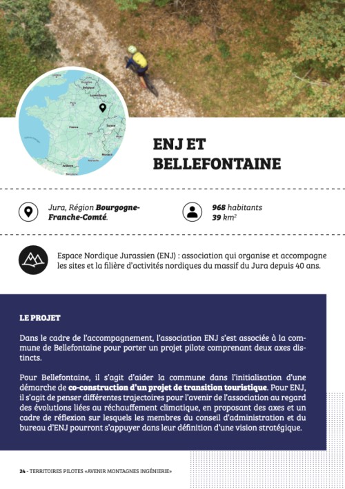 Depuis 40 ans, les associations Espace Nordique Jurassien (ENJ) et Grandes traversées du Jura (GTJ), fédèrent, organisent et accompagnent les filières d’activités nordiques et des sports de pleine nature à l’échelle du massif du Jura. Dans le cadre de l'accompagnement, elles se sont associées à la commune de Bellefontaine (93) et portent un projet pilote comprenant deux axes distincts.