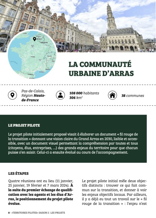 Le projet pilote initialement proposé visait à élaborer un document « fil rouge de la transition » donnant une vision claire du Grand Arras en 2030, lisible et accessible, avec un document visuel permettant la compréhension par toutes et tous (citoyens, élus, entreprises, …) des grands enjeux du territoire pour que chacun puisse s’en saisir. Celui-ci a ensuite évolué au cours de l’accompagnement.