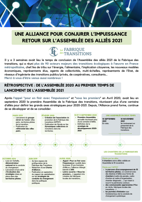 L’Assemblée des alliés 2021 de la Fabrique des transitions, pensée comme un processus en deux temps (10 septembre et 10 novembre), a réuni plus de 90 acteurs des transitions écologiques en France pour son temps de clôture, le 10 novembre dernier. Merci à vous d’être venus si nombreux !