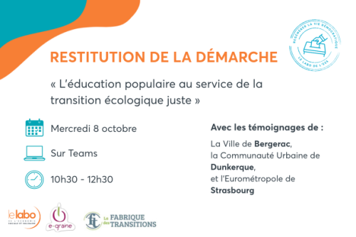 Après deux ans d’expérimentation, découvrez les conclusions de l’étude-action « L’éducation populaire au service de la transition écologique juste » menée par Le Labo de l’ESS, e-graine et La Fabrique des transitions dans trois territoires pilotes, lors d’un webinaire de restitution le 8 octobre.