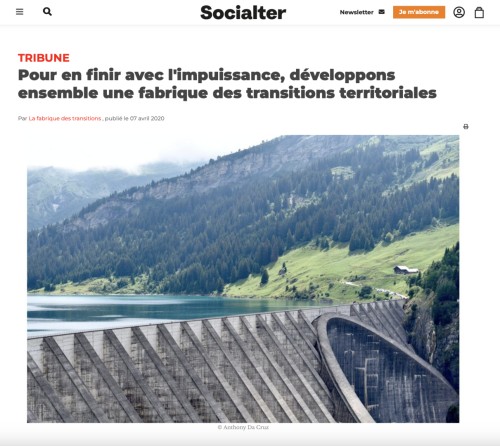 "Si le COVID-19 secoue tout notre système économique mondialisé, le chemin d'une transition vers un nouveau modèle, durable et solidaire, n'a pas encore été tracé. Or, les communautés humaines que sont les territoires sont les plus aptes à engager ce mouvement. Nombre d'acteurs déjà engagés dans ces transitions proposent d'unir leur forces et d'accélérer cet élan. Socialter relaie l'appel de la Fabrique des Transitions."